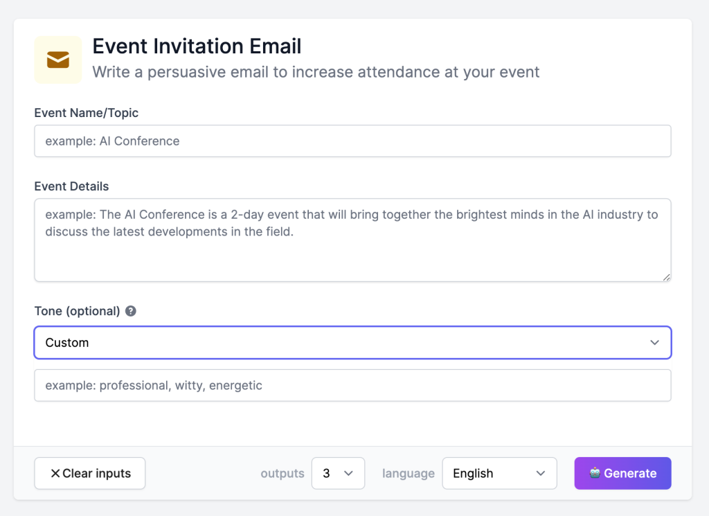 - Number of Outputs: Finally, dictate how many different versions of the email you want the AI to generate. If you want to test different invitations or have a broad audience, you might request multiple outputs.