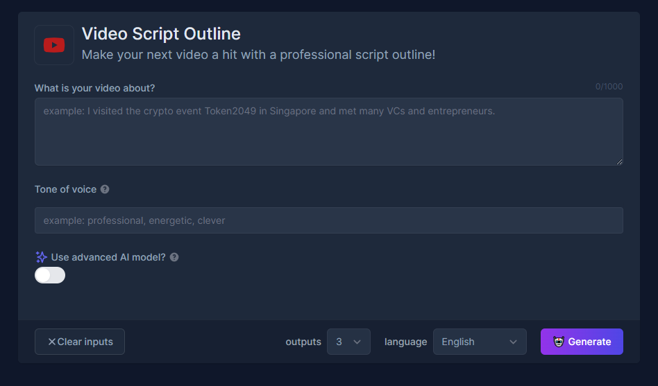 Just type in what your video is about, and set your tone of voice. Select the language you want, then hit generate. Your YouTube video script will be ready!