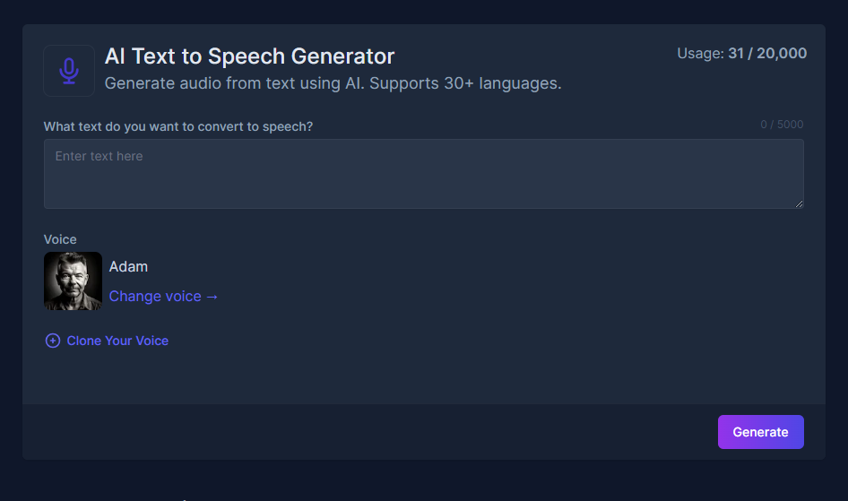 AI text-to-speech in Easy Peasy AI uses advanced speech synthesis to convert text into natural-sounding speech. Experience the power of AI Text-to-Speech with Easy Peasy AI. Unleashing diverse voices across numerous languages, the platform boasts over 60 distinct voices spanning more than 30 languages. Select the voice that aligns seamlessly with your unique style. Moreover, with Text-to-Speech in Easy Peasy AI, you can clone your voice, adding an extra layer of personalization to your audio content.