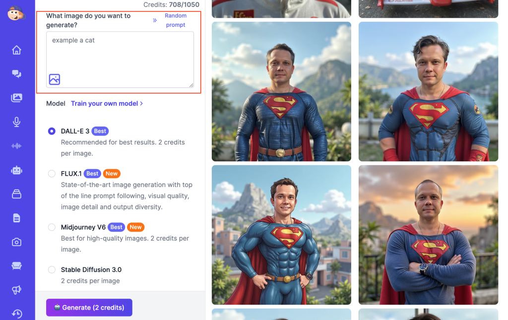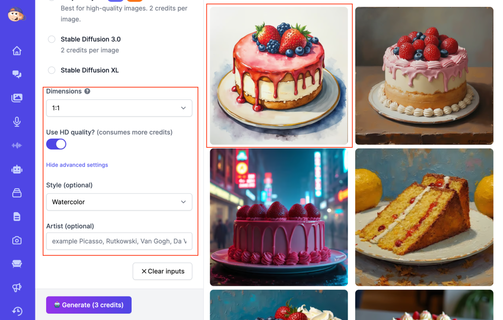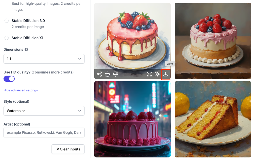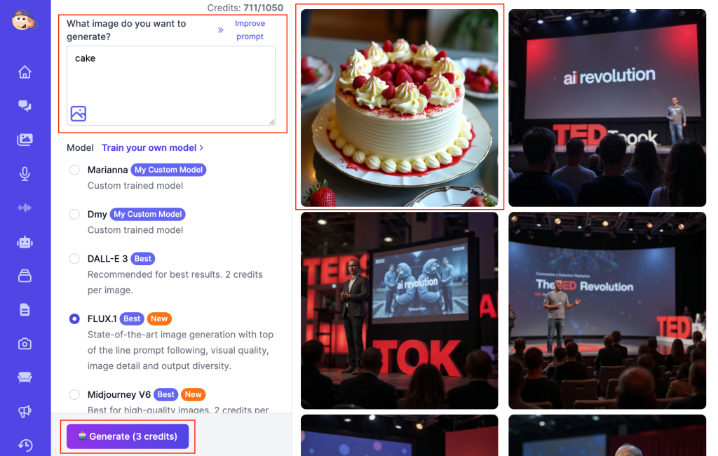 • Enter a prompt (e.g., “cake”) and click Generate.