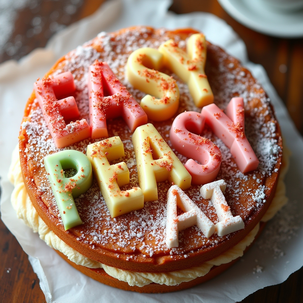 Cake spelling out the words “EASY-PEASY.AI”, tasty, food photography, dynamic shot