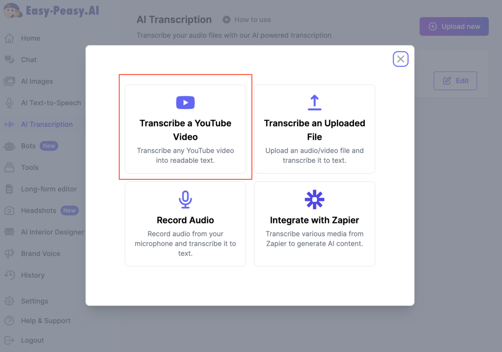 2. Choose “Transcribe a YouTube Video”: From the options provided, select “Transcribe YouTube Video.”