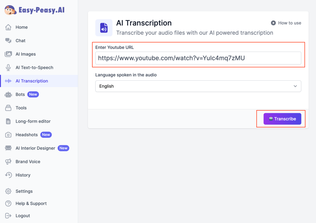 2. Paste the URL: Return to Easy-Peasy.AI and paste the copied URL into the designated field.
