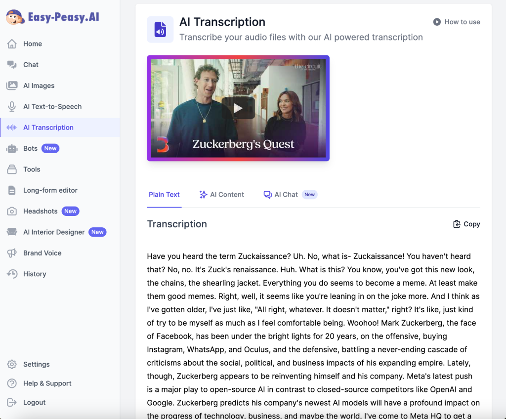 1. Wait for Transcription: Within seconds, Easy-Peasy.AI will transcribe the video and provide you with the plain text.