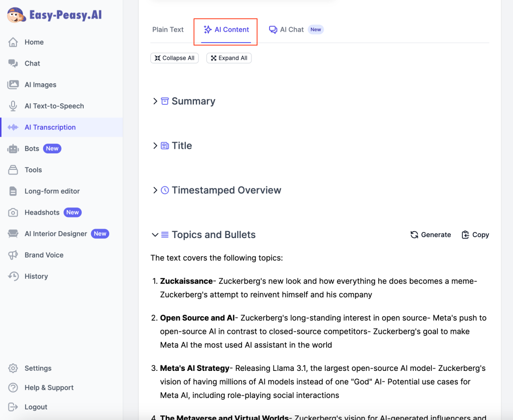 1. Click “AI Content”: Next to the plain text, click on the “AI Content” button to convert the transcription.