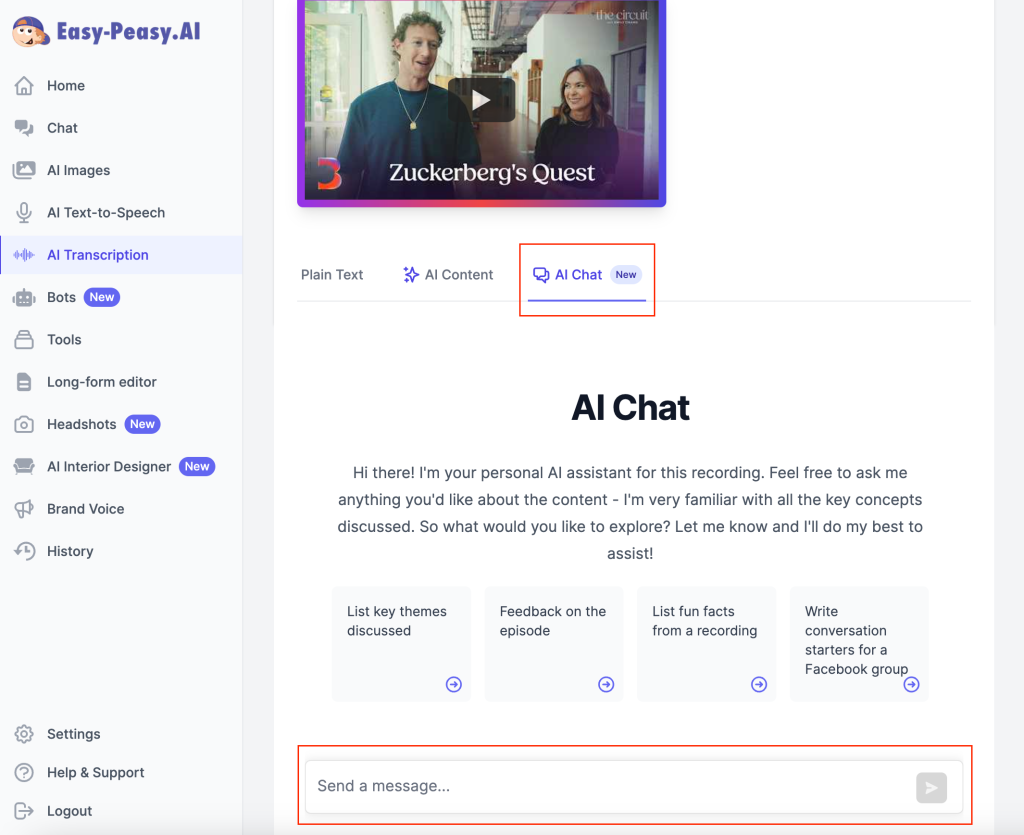 1. Navigate to AI Chat: If you have any specific questions about your transcription, go to the AI Chat section.