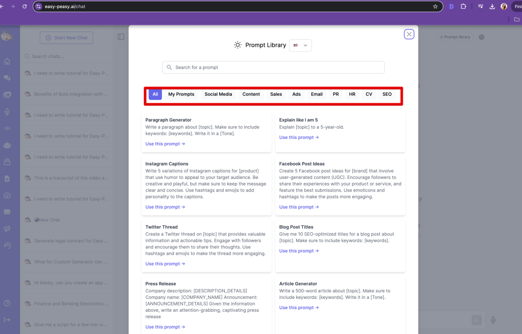 - Explore different categories like “Social Media” and choose prompts to quickly generate content.