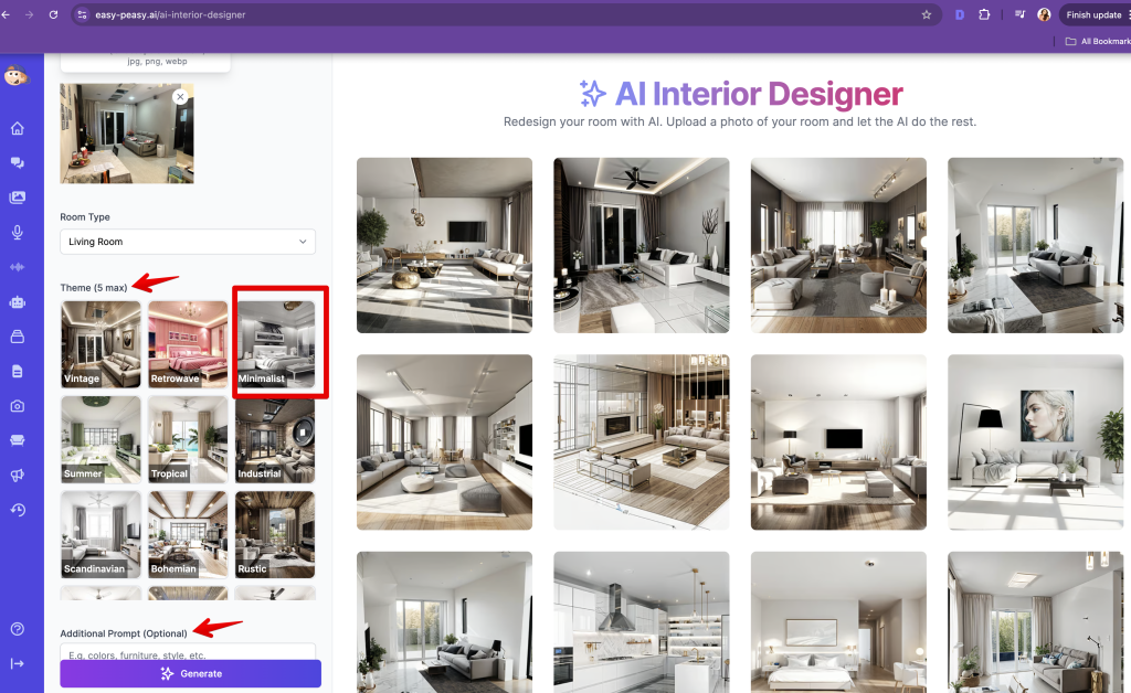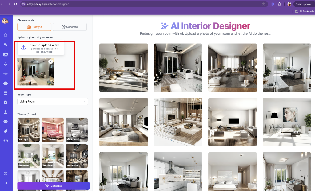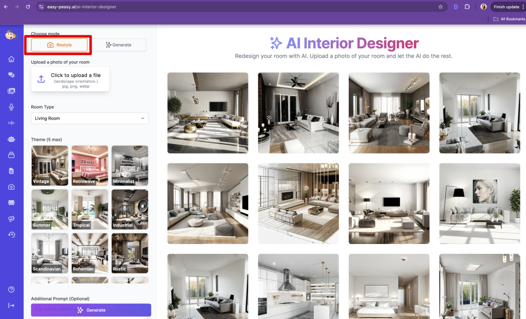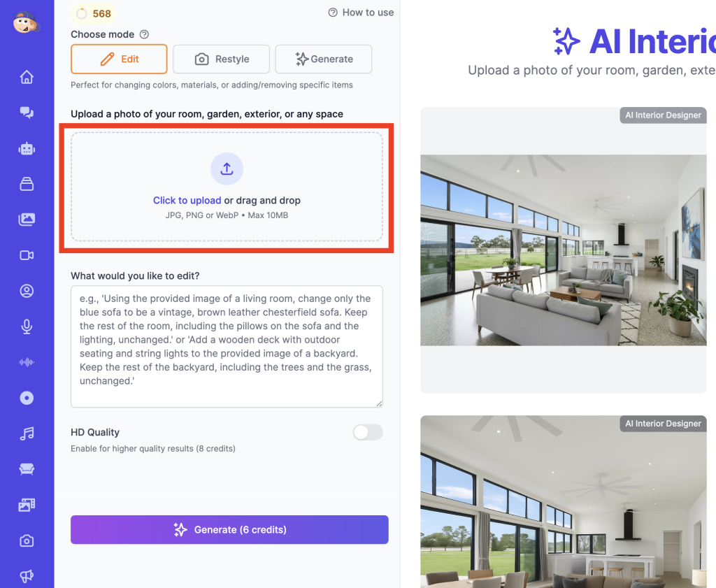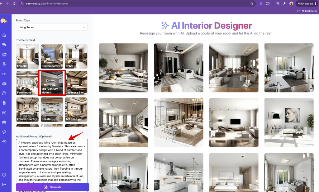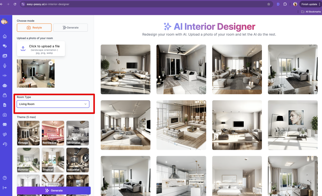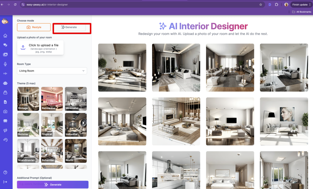 - Generate: Create entirely new room designs from scratch based on room type and style preferences.