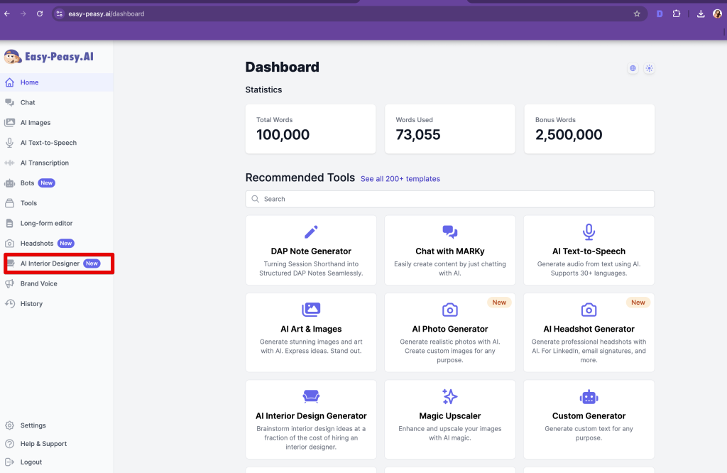 Step 1: Sign Into Easy-Peasy.AI and Access the AI Interior Designer
