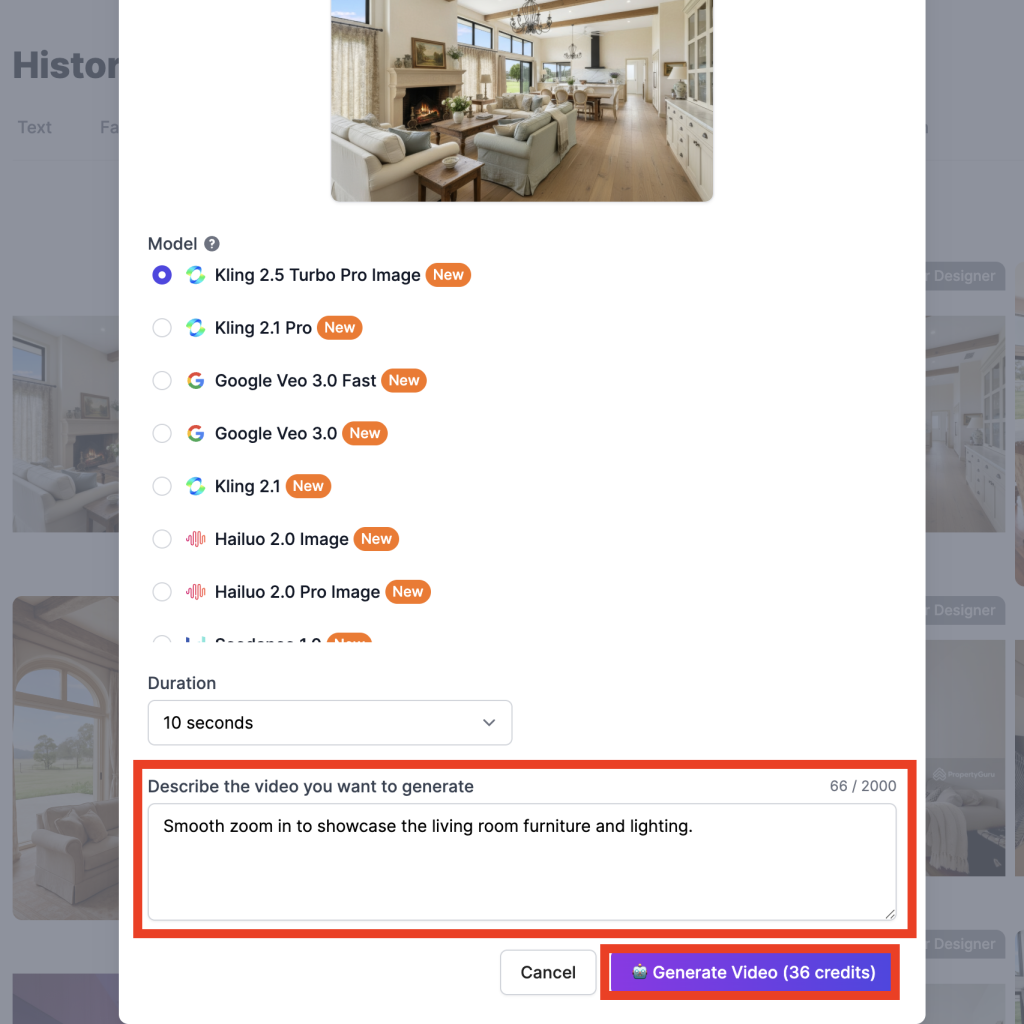 - In the modal, describe the camera movement and style for your flythrough. Keep it concise to focus on motion.