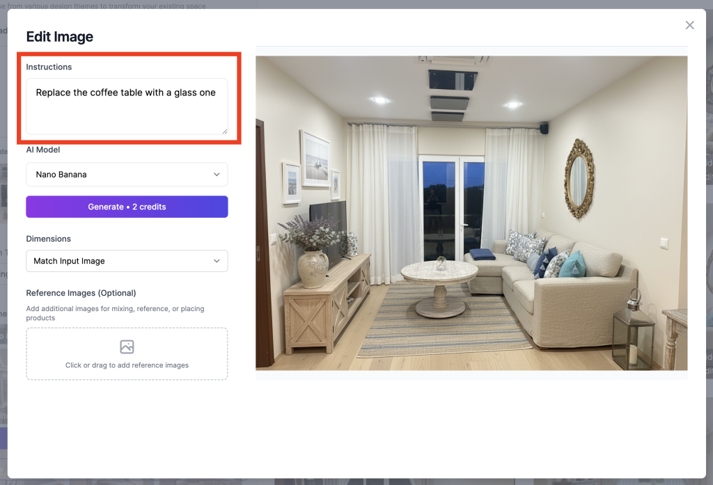 - Edit: Modify specific elements like colors, furniture, or decor while keeping the room layout intact. Perfect for changing colors, materials, or adding/removing specific items.