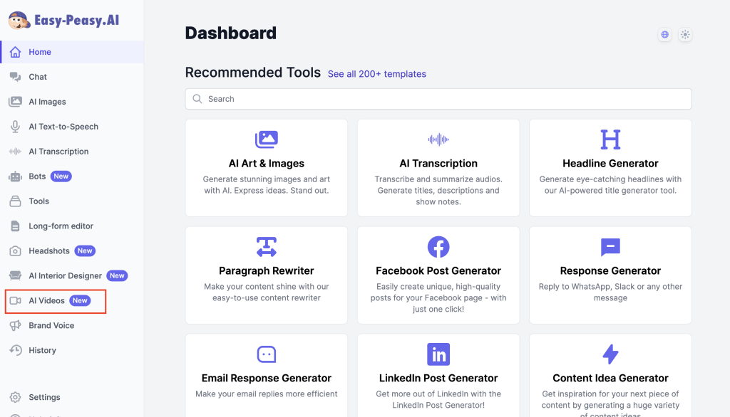 - From your dashboard, look for “AI Videos” in the AI tools section