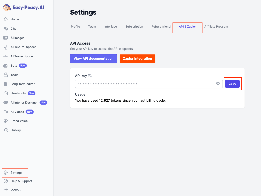 Replace YOUR_API_KEY with your actual API key. You can find your API key in your Easy-Peasy.ai account settings.