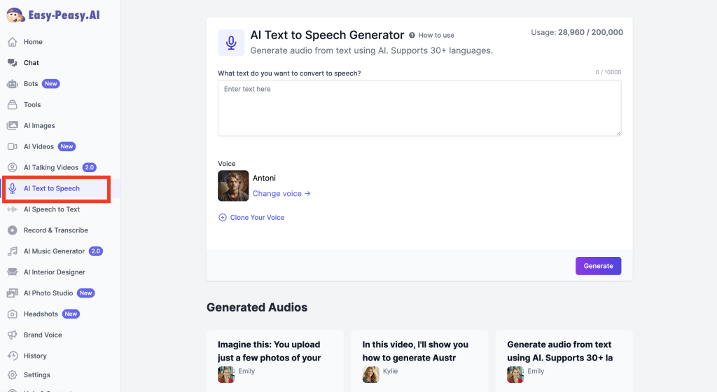 Log into your Easy-Peasy.AI dashboard and navigate to the left sidebar. Click on the “AI Text to Speech” link to access our powerful voice generation tool. You’ll be redirected to a user-friendly interface where the magic happens.