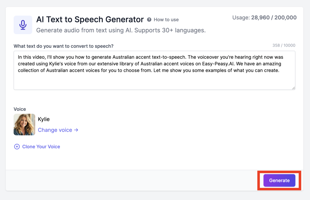 Sign up for Easy-Peasy.AI today and join thousands of content creators who trust our AI-powered tools. With our intuitive interface and extensive voice library, you’ll be creating professional Australian accent content in no time.