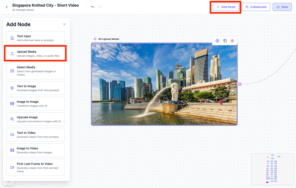 - Connect the image: Drag the output handle from your Upload Media node to the image input of the Image to Image node