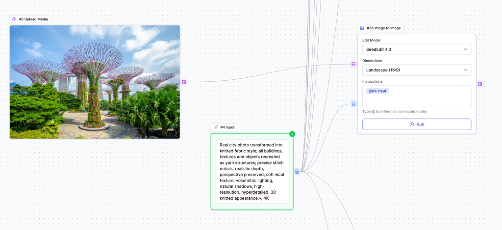 Alternative: You can also type the prompt directly into the Instructions field within the Image to Image node instead of using a separate Input node. However, using an Input node makes it easier to maintain consistency when you have multiple Image to Image nodes sharing the same prompt.