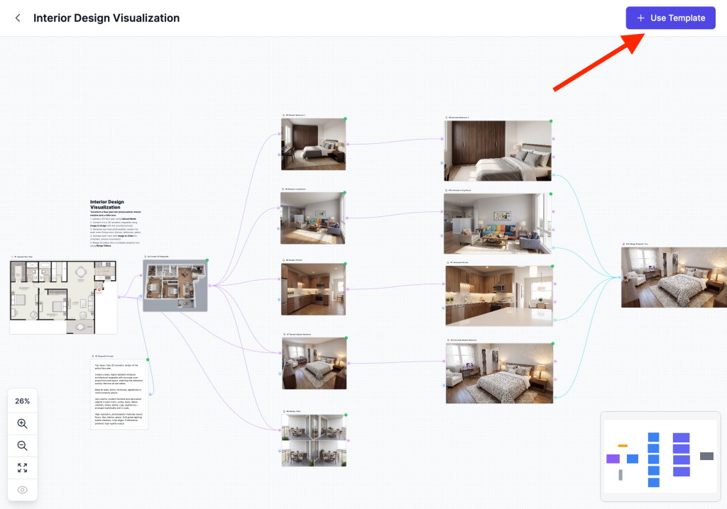 Click on the template to open a preview. You’ll see the complete workflow laid out visually, showing how your floor plan will flow through each transformation stage. Click the Use Template button in the top right corner to clone this workflow to your account.