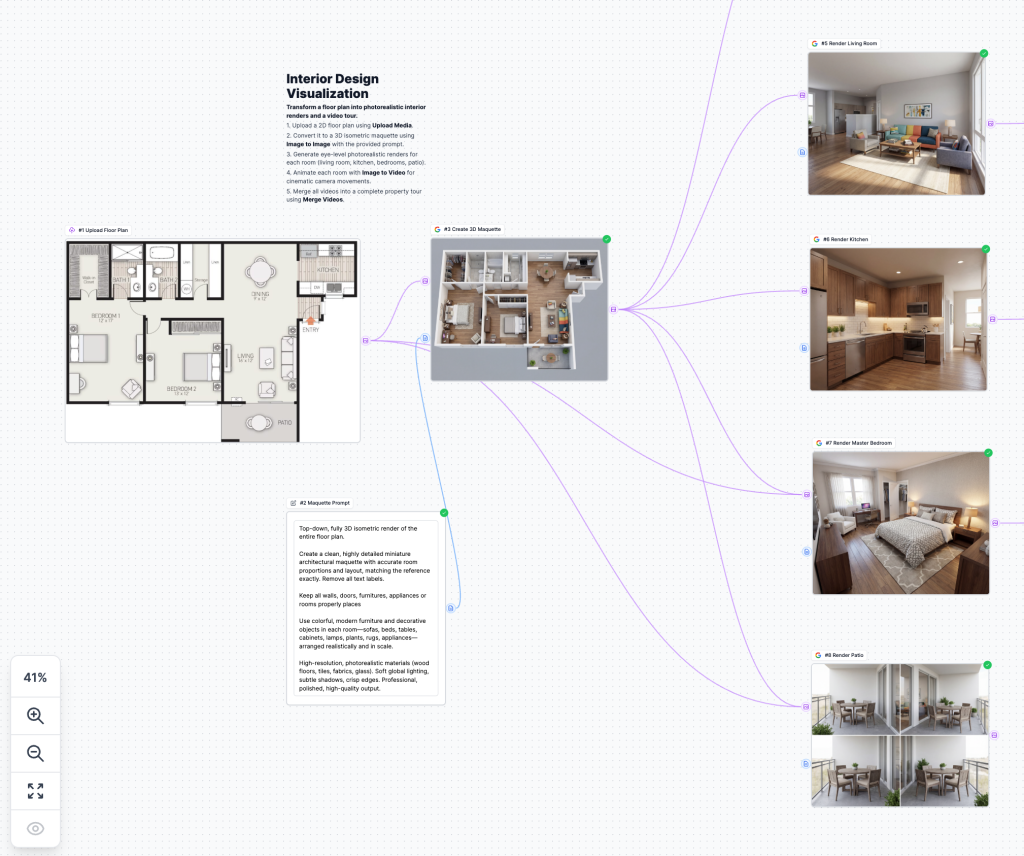 Each animation node uses Easy-Peasy.AI’s Image to Video feature to add cinematic camera movements – smooth pans, subtle zooms, and gentle reveals that make your room visualizations feel like professional architectural walkthroughs.