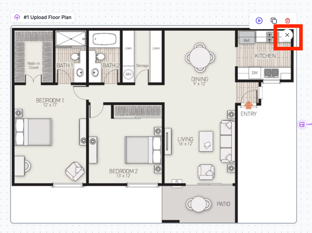 The Upload Floor Plan node with action icons – click the X to remove the default image