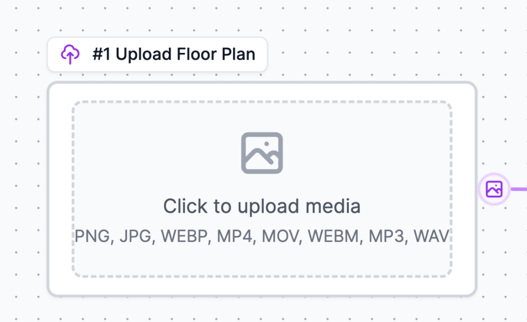 The first node in the workflow is labeled #1 Upload Floor Plan. This is where you’ll add your 2D architectural blueprint.