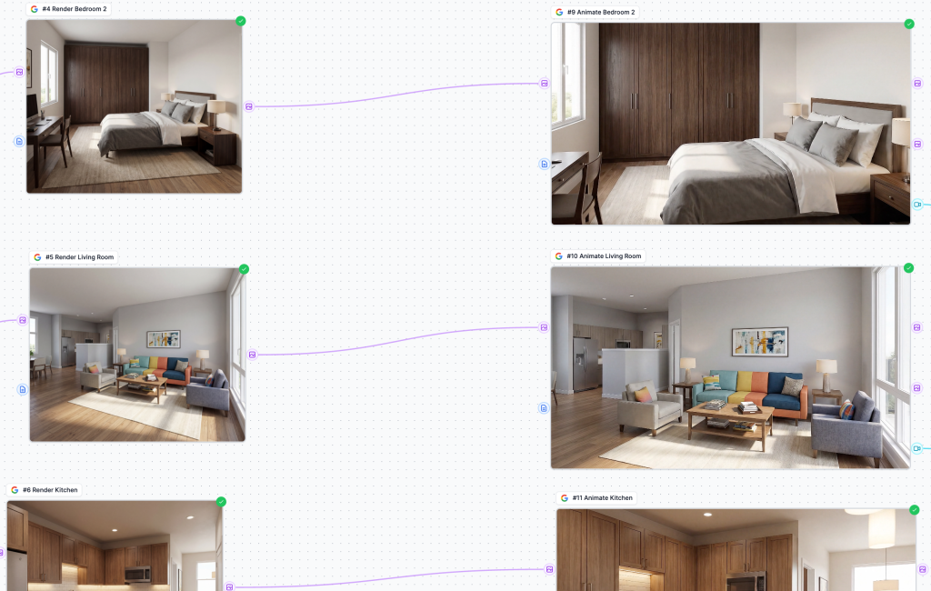 The workflow generates photorealistic renders for each room in your floor plan