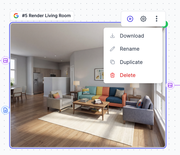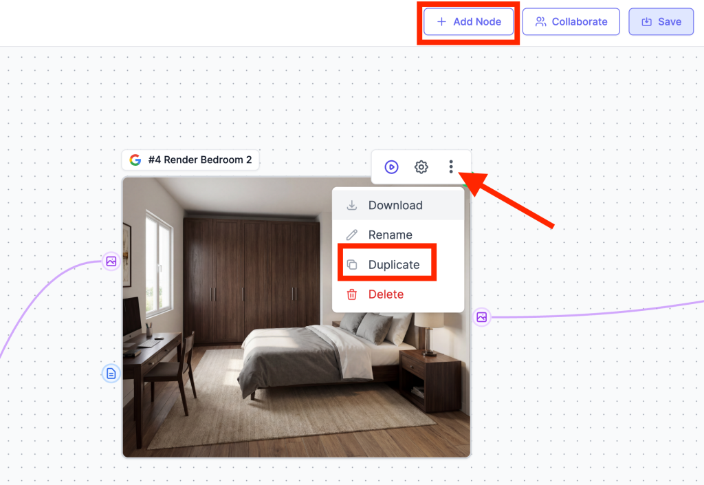 Click Add Node or Duplicate existing node to add more room renders for larger floor plans, or delete nodes for simpler layouts. The workflow is fully customizable to match your floor plan’s room count.