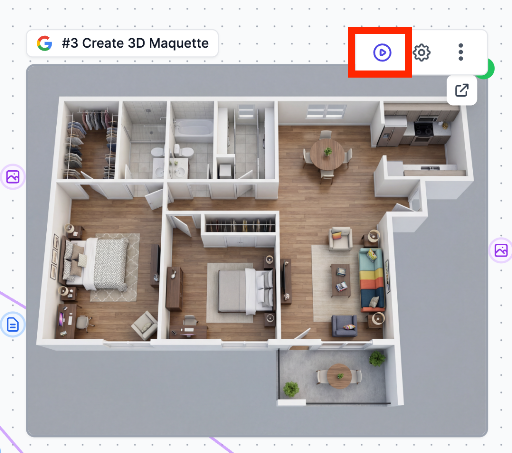 The second major node (#3 Create 3D Maquette) uses Easy-Peasy.AI’s Image to Image capabilities to transform your flat floor plan into a stunning 3D isometric visualization.