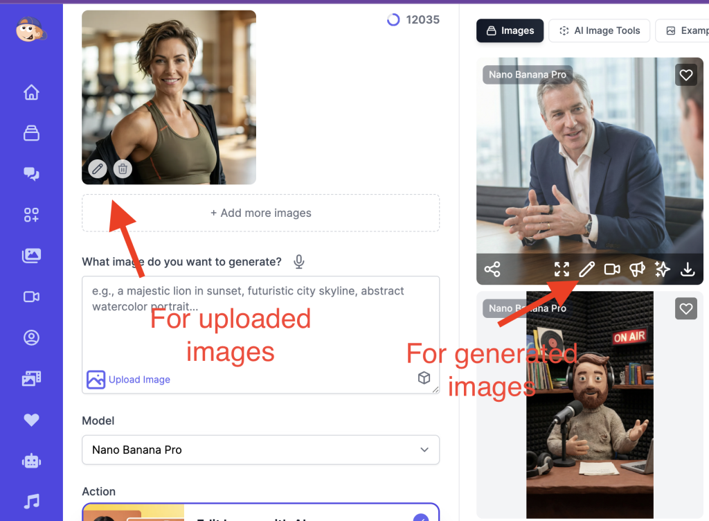 Navigate to the AI Image Generator, upload the image you want to edit (or generate a new one), and click the Edit button.