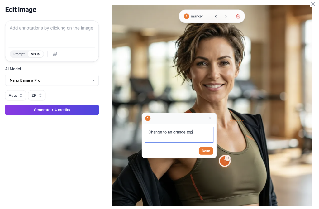 Instead of running the same image through 3–4 separate prompt-based edits (and risking quality loss each time), you can place multiple markers across the image. Want to change the sky, remove an object in the corner, and adjust someone’s outfit? Add three markers, describe each change, and generate once.