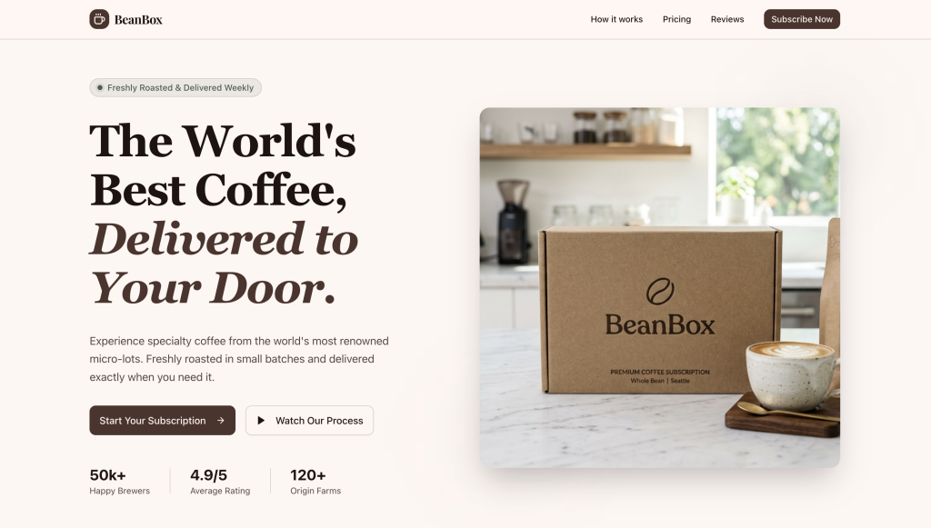 - Subscription box site — Plan selection, product previews, and subscriber testimonials