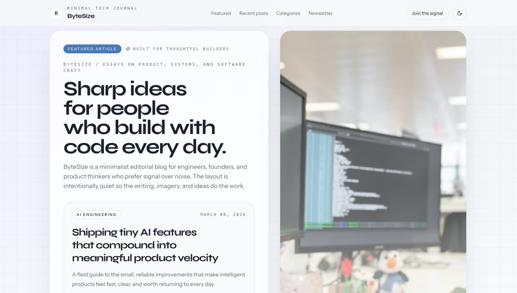 - Tech blog — Code-friendly layout with syntax highlighting and tag-based navigation