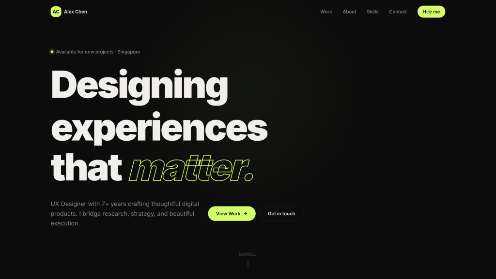 Try describing your own: “Build a minimalist portfolio for a UX designer. Dark background, large project thumbnails in a grid, an about section with my photo, skills list, and a contact form. Use Inter font and subtle hover animations.”